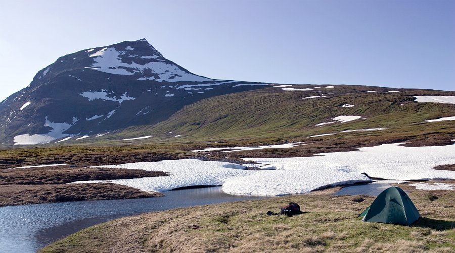 Razím ve 14:30, míjím bivak Parte a předháním čtveřici Rakušanů z Vídně - 3 kočky a 1 kluka. Je vedro a oni vypadají, že nedožijí večera. Cesta vede do ošklivého kopce a potkávám dalších asi 5 lidí - je vidět, že za Kvikkjokkem už pomalu začíná "turistická" část cesty... Po 15ti km jsem na hřebeni a kempuju naproti impozantní stolové hoře Thjahkelij. Naní na ní značen žádný přístup, na mapě jsou pouze značená 2 místa jako "Ancient place of special interest". Tato hora mě velice zajímá! Fouká silný vítr, 5°C.19. DEN